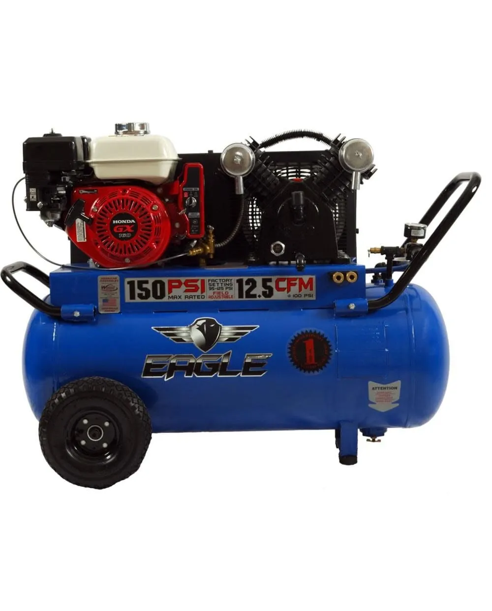 Eagle P55G25H1 25 Gallon ASME horizontal portable capacity tank. 5.5 HP Honda GX160-OA engine and 9HP Honda GX270-OA engine.