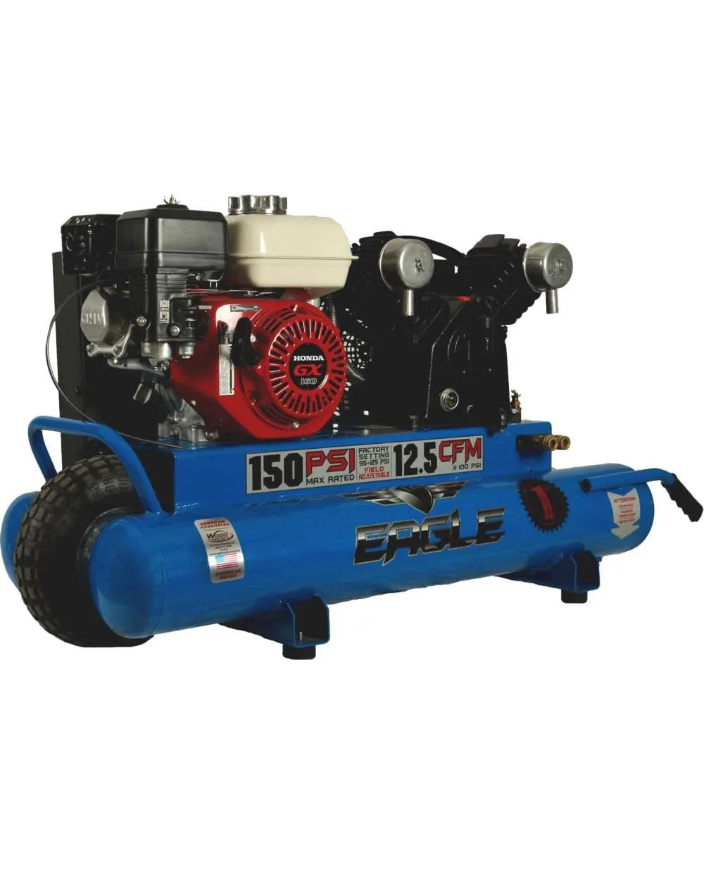Eagle TT55GE 10 gallon capacity twin tanks. 5.5 HP Honda GX-160 gas powered engine for smooth quiet operation and maximum reliability. It features a “V” design cast iron cylinder compressor pumps with individual and removable cylinders for smoother and cooler operation. Steel rim pneumatic tire for easy handling and maneuverability. Convenient oil drain on front of the unit. Easy view oil sight gauge. Outlet control regulator with quick connectors. Efficient heat removal from pulley-fan for cooler running and longer life. Electric start engine.