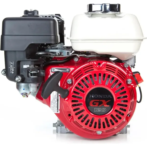 Honda GX120 HX2 (GX120UT2HX2) horizontal OHV 6:1 gear reduction engine is 120cc and puts out 3.5 net HP. This Honda GX has a 3/4″ x 1.97″ crankshaft. The engine has recoil start, a standard muffler with spark arrestor and oil alert system.